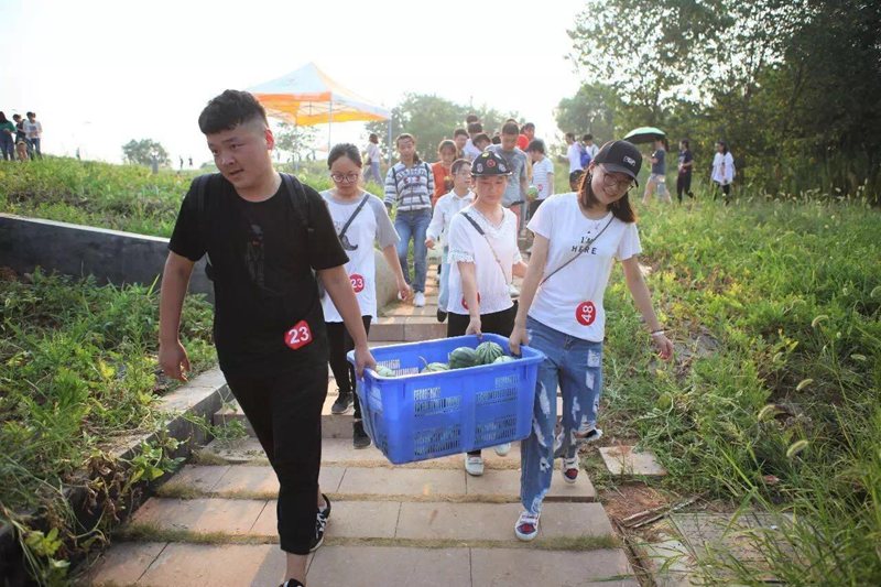 原來,浙師大的后山上有一片西瓜地,同學(xué)們早就“虎視眈眈”,今天終于如愿“下手”了!這場摘瓜大賽需要報名組隊,參賽小組在30分鐘內(nèi)把西瓜放至指定地點,摘瓜多并且沒有破損就可以獲勝。于是在主持人介紹完活動規(guī)則和注意事項后,一聲令下,各小組便拿上筐沖向瓜地。