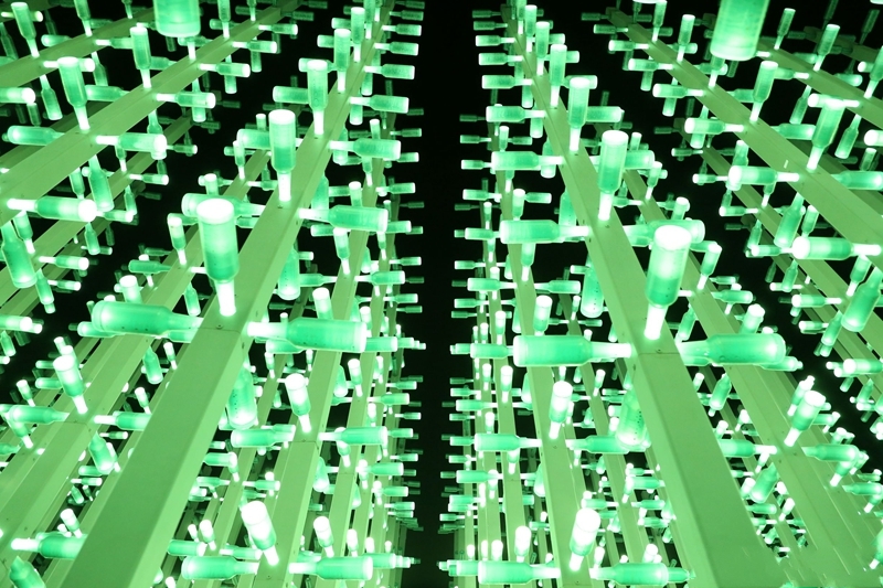據(jù)悉,這片占地約兩百平米,由千余根 “啤酒樹”組成的“啤酒叢林”。伴著舒緩的背景音樂,由鋼立柱制作而成的“瓶酒樹”上30000余個(gè)塑料啤酒瓶受互動(dòng)光作用。